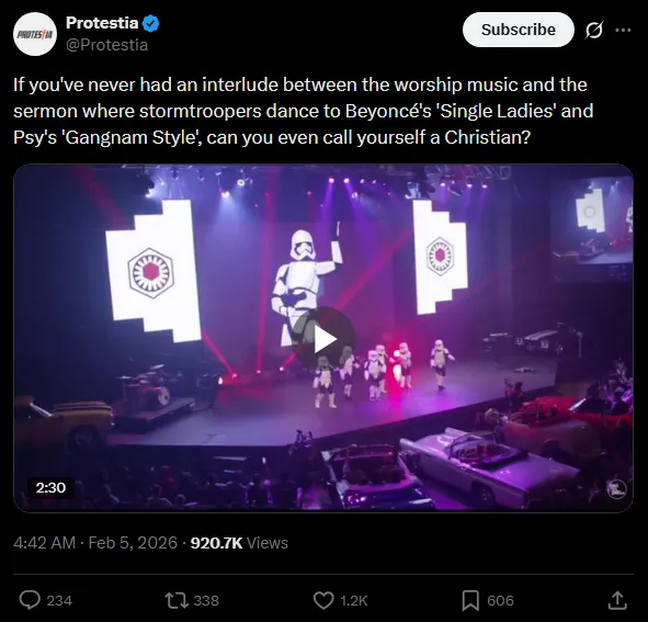 Some Christian churches have gone totally off the deep end. I don’t understand why. I haven’t dug into the doctrinal differences that would lead to these extremely goofy logic fractals where you somehow can have Stormtroopers dancing Gangham Style under a lights show. Many millions of Americans across the Bible Belt rock out to Jesus in these mega churches. I don’t understand it. I’ve attended a number of services at churches like these and it just bewilders me. Feels like I’m experiencing the madness of whoever is in charge of the show.
