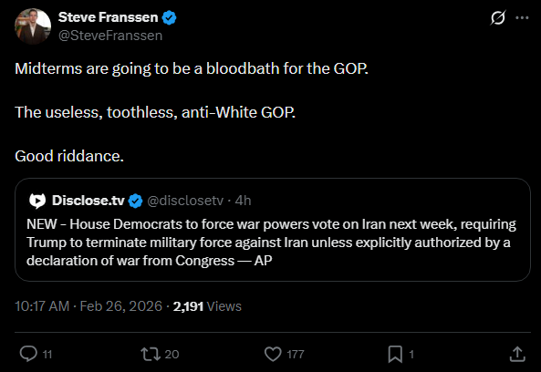 I guess I’ll hope for a limited decapitation strike. Once the money’s stolen, there’s no morality in it and so then you’re just stumping for your personal interests. I guess my personal interest is that as few White men, zero if possible, die in any conflict with Iran. Of course, I don’t want anyone to die. That’s because I’m kind-hearted. That’s a turnoff for a lot of people these days because everyone’s minds have been gooped by short-form video content and a constant barrage of negativity via headlines (sorry I did that earlier to you).